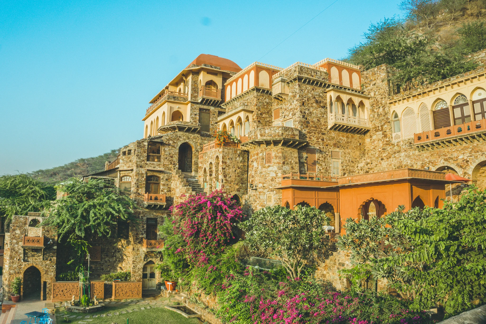 For longer than the western world can remember, there have been Maharajas and Maharanis ruling India in splendid celebration and ceremonial furor. Age after age of vast kingdoms ruled from colorful palaces, developing their own science, medicine and philosophy, and warring for Gods, for love, and for land. The history of India is so rich and immense, visualising it is much like a watching Bollywood movie; a dizzying display of passion, pride, and colorful celebration. Five hundred years after the golden age of Indian royalty, Josh and I have arrived at the steps of the Neemrana Fort Palace, and the sun is rising. The gardens of the grounds are quiet and misty, alluding to a haunting sort of peace that Iβm sure only comes with 500 years of proud and stoic existence. At the Neemrana Fort Palace time doesnβt stop, but rather dances with you, twirling you in and out of a 15th century Indian fantasy. The Neemrana Fort Palace is a perfect getaway for maharanis and maharajas (kings + queens) alike, and I pray to many gods that I return here in another life.